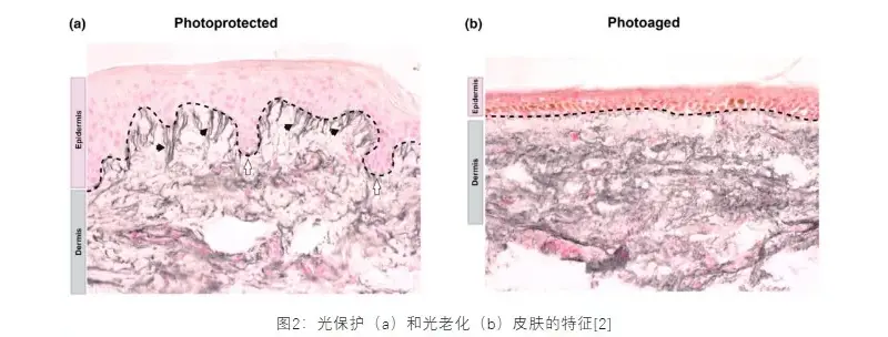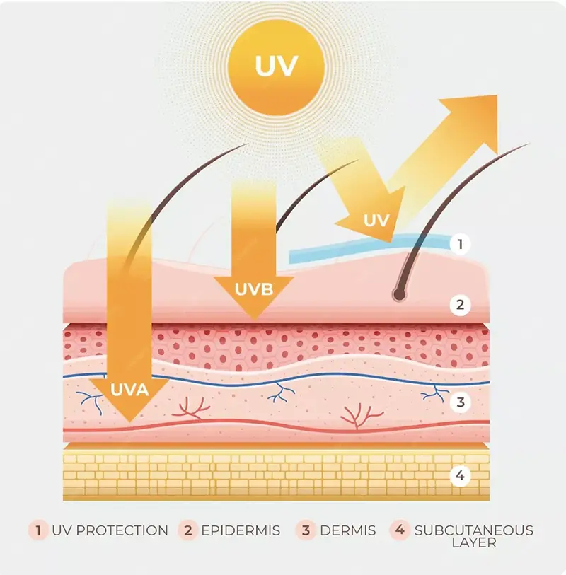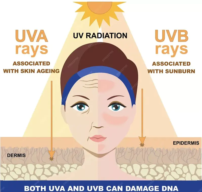 هر دو UVA و UVB می توانند باعث آسیب به پوست شوند، اما اثرات آنها عمدتاً به دلیل عمق نفوذ آنها متفاوت است. واضح است که اشعه ماوراء بنفش غنیتر میتواند به عمق درم نفوذ کند و مستقیمتر با پیری نوری مرتبط است، زیرا ROS تولید میکنند و کلاژن و الاستین را تخریب میکنند که منجر به چین و چروک، از دست دادن قابلیت ارتجاعی پوست و سایر علائم پیری زودرس میشود. در مقابل، UVB عمدتاً اپیدرم را تحت تأثیر قرار می دهد و باعث آفتاب سوختگی (اریتم خورشیدی) و تولید ملانین در کوتاه مدت می شود، در حالی که قرار گرفتن در معرض طولانی مدت می تواند منجر به هیپرکراتوزیس شود و به طور قابل توجهی خطر تومورهای بدخیم پوست را افزایش دهد.