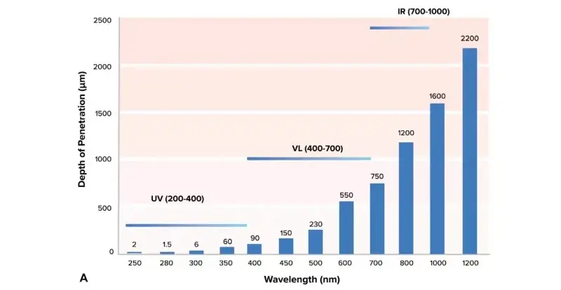همانطور که در شکل بالا نشان داده شده است، نور مرئی تاثیر زیادی روی پوست دارد، زیرا این باند عمق نفوذ عمیق تری به پوست دارد. نور قرمز می تواند به اپیدرم و درم نفوذ کند و به لایه چربی برسد که نشان دهنده رابطه بین طول موج و عمق نفوذ و رابطه معکوس بین طول موج و انرژی است، در حالی که نور آبی انرژی بالاتر و عمق نفوذ کمتری نسبت به نور قرمز دارد.